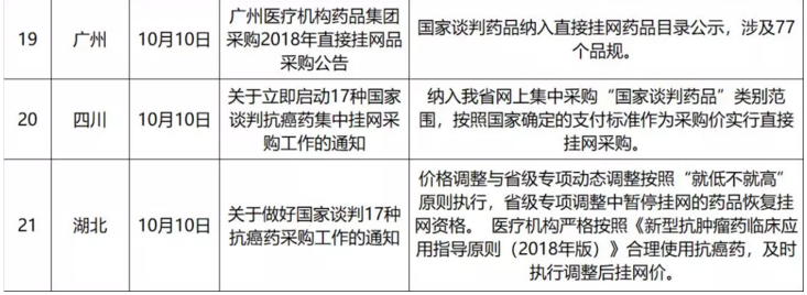 第二天(10月11日)即有2个省份——四川、湖南率先宣布相应产品挂网。据健识君不完全统计,截至目前,至少已有湖北、四川、浙江、黑龙江、福建、天津、贵州、广西、广州等21省(直辖市、自治区)、市落实相关品种开始挂网采购或明确报销比例。按照国家医保局的要求,患者11月底前逐步能买到降价后的抗癌药。