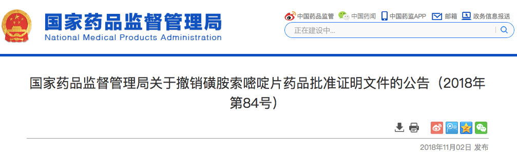 11月2日,国家药监局发布《关于撤销磺胺索嘧啶片药品批准证明文件的公告(2018年第84号)》。