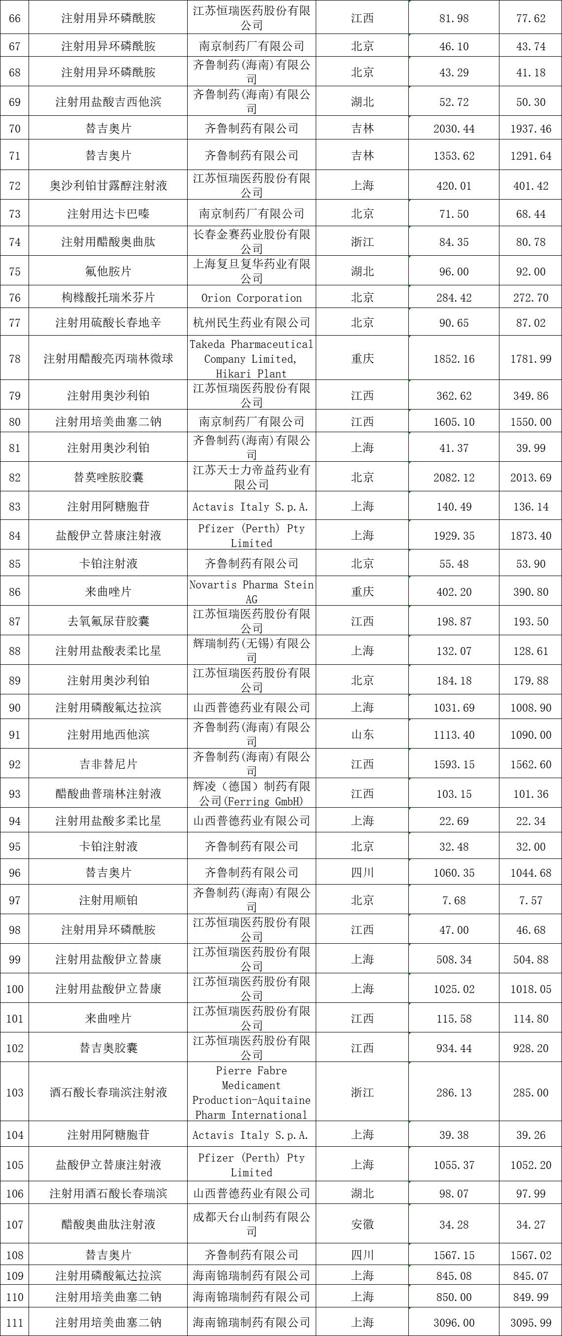 据通知,根据四川省卫生和计划生育委员会《关于印发<2018年度四川省抗癌药专项集中采购实施方案>的通知》(川卫函〔2018〕229号)、《关于开展2018年度四川省抗癌药增补工作的通知》(川药械采〔2018〕187号)和《关于开展2018年度四川省抗癌药最高挂网限价动态调整的通知》(川药械采〔2018〕205号)相关要求,按照企业填报的最新省级最低价,对替吉奥胶囊等111个药品的中标/挂网价予以动态调整。
