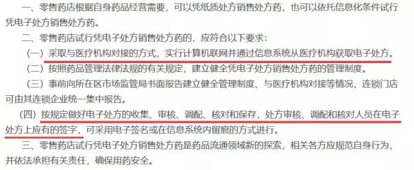 结合天津市关于零售药店试行凭电子处方销售处方药的文件来看,药店要从医疗机构获取电子处方,处方审核、调配、核对也需配合以上要求。