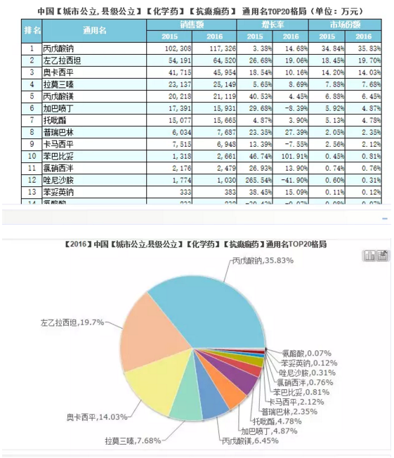 据统计,抗癫痫药在等级医院和零售药店2016年销售额为38.2亿元,同比增长10.4%,较2013年复合增长率为10.8%。2015-2016年抗癫痫化学药TOP20产品中,拉莫三嗪、托吡酯分别位居前列。作为新型抗癫痫药的代表,拉莫三嗪、托吡酯具有较好的药代动力学特点,不良反应较少,特别是药物间相互影响小而使得在药物联合应用时限制较少。高效、低风险和低副作用的优势使得拉莫三嗪、托吡酯等新型抗癫痫药占据很大的市场份额。