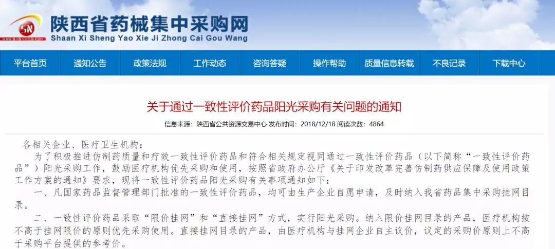 近日,陕西省公共资源交易中心发布《关于通过一致性评价药品阳光采购有关问题的通知》(以下简称《通知》)。