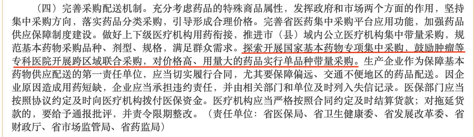 探索开展国家基本药物专项集中采购,鼓励肿瘤等专科医院开展跨区域联合采购,对价格高、用量大的药品实行单品种带量采购。
