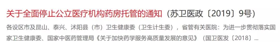 日前,江苏省卫健委和江苏省中医药管理局发布《关于全面停止公立医疗机构药房托管的通知(苏卫医政〔2019〕9号)》(以下简称《通知》)。