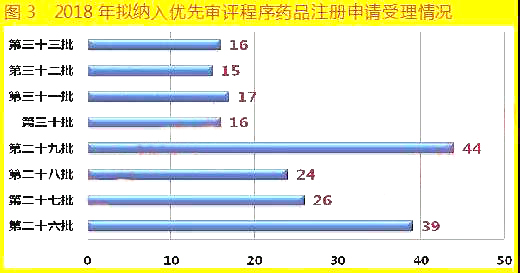 2018年截至10月17日,CDE共发布了8批次共197个拟纳入优先审评程序的药品注册申请名单,具体各批次数量如图3所示(2018年为第26~33批)。在2018年11月7日之后,CDE发布公告不再对拟纳入优先审评程序的药品按批进行公示,调整为即到即审方式组织专家进行审核,确定优先审评的品种。