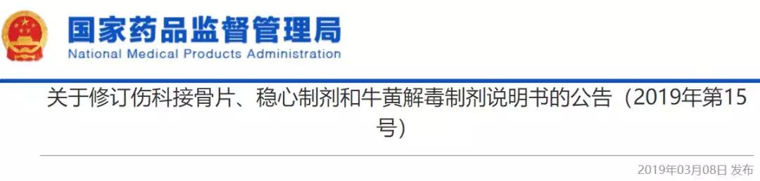 3月8日,国家药监局发布《关于修订伤科接骨片、稳心制剂和牛黄解毒制剂说明书的公告(2019年第15号)》(详见附件)。