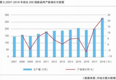 一是家种药材快速发展,供给明显过剩。在中医药产业快速发展及精准扶贫的背景下,发展中药材生产成为热点。有分析显示,2018年全国585个贫困县几乎全在发展中药材种植,扩张前10位品种分别是柴胡、黄芪、党参、桔梗、黄芩、黄精、重楼、板蓝根、白及和金银花(见图1)。2004~2017年,综合200指数品种产能从104.73万吨增长到202.16万吨,增长了93.03%,年均增速6.65%。2018年,综合200指数品种产能突破282.68万吨,同比增速达23.30%,超过需求增速10.02个百分点,产能严重过剩(见图2)。