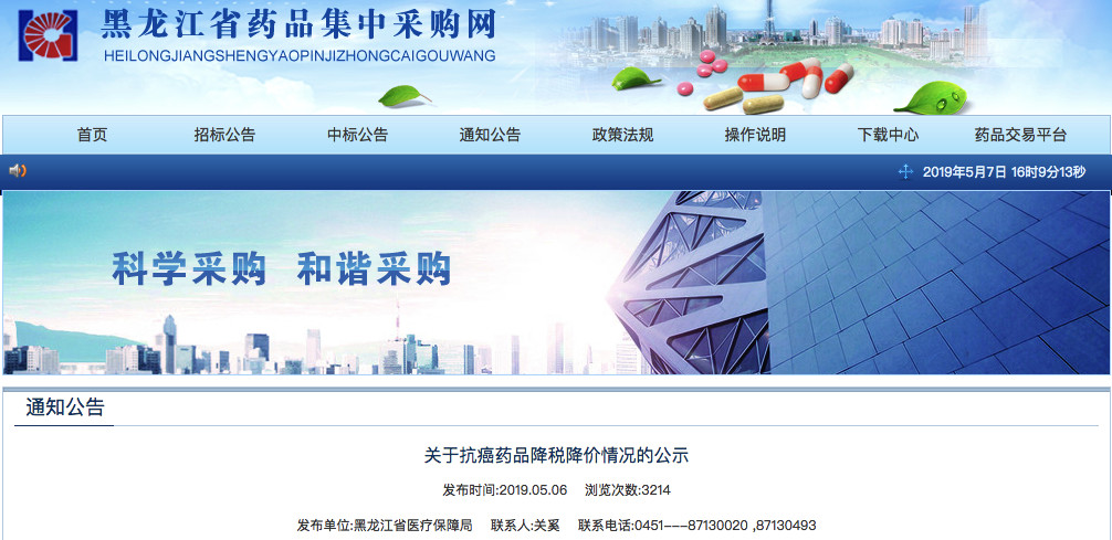 通知显示,依据《关于进一步做好抗癌药品降价降税工作的通知》(黑医保办发〔2019〕7号)要求,药品生产企业按照不高于已经完成降税降价的全国其他各省最低价的原则进行了申报。现将参与黑龙江省药品集中采购的相关药品生产企业降税降价情况予以公示。