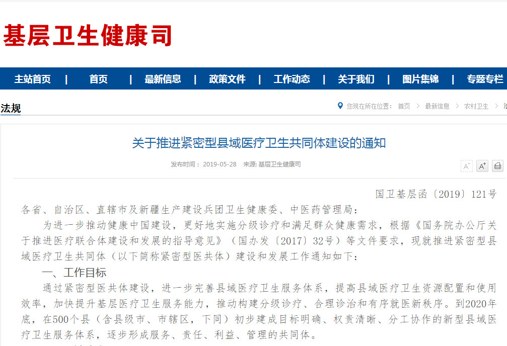 医药网5月29日讯 5月28日,国家卫生健康委官网发布《关于推进紧密型县域医疗卫生共同体建设的通知》(下称《通知》),要求到2020年底,在500个县初步建成目标明确、权责清晰、分工协作的新型县域医疗卫生服务体系,逐步形成服务、责任、利益、管理的共同体。