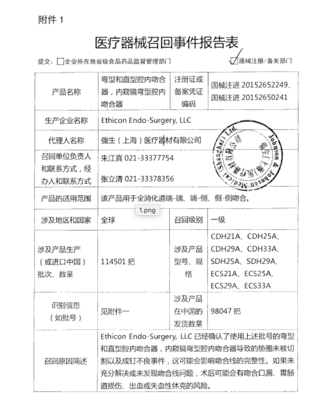 据强生提供的报告表中显示,召回原因为:生产商已经确认了使用上述批号的弯型和直型腔内吻合器,内窥镜弯型腔内吻合器导致的垫圈未被切割以及成钉不良事件,这可能会影响吻合线的完整性。