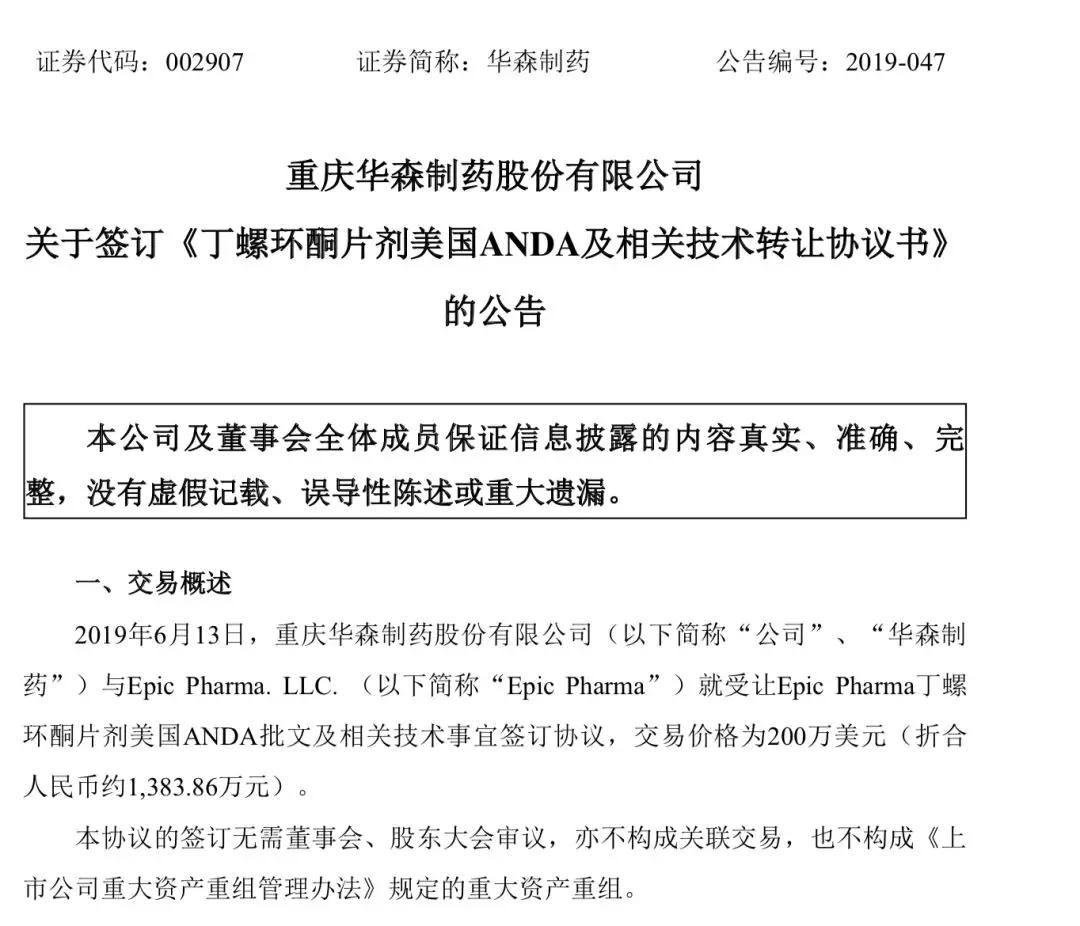 6月13日,重庆华森制药发布关于签订《丁螺环酮片剂美国ANDA及相关技术转让协议书》的公告。