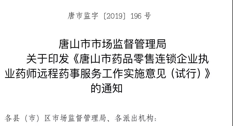 近日,为了解决执业药师短缺问题,科学规范执业药师远程处方审核、指导合理用药等药事服务工作,唐山市印发了《唐山市药品零售连锁企业执业药师远程药事服务工作实施意见(试行)》的通知(以下简称《通知》)。