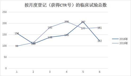 临床试验登记数量来看,2019年上半年同比增加较多,其中4月更是达到了208个临床试验,与2018年5月的最高值207持平。