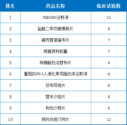 对药品的临床试验登记情况统计发现,2019上半年最受关注的药品为TQB2450注射液,其次是盐酸二甲双胍缓释片。TQB2450注射液是正大天晴集团研发的创新型抗PD-L1单克隆抗体药物,由该公司附属公司南京顺欣制药有限公司申请,注册分类为治疗用生物制品。TQB2450注射液拥有结构、配方及工艺等多项自主知识财产权。