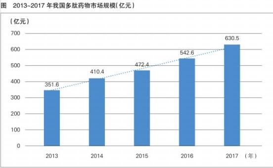 据中国产业调研网发布的《2019~2025年中国多肽药物行业发展研究分析与发展趋势预测报告》,我国近年来多肽药物市场规模同样呈上升趋势,2017年达到630.5亿元(见图),这要归因于我国人口基数大、老龄化加剧,存在大量的肿瘤及慢性病患者。预计未来这一市场需求将不断扩大,多肽药物仍有大幅增长空间。