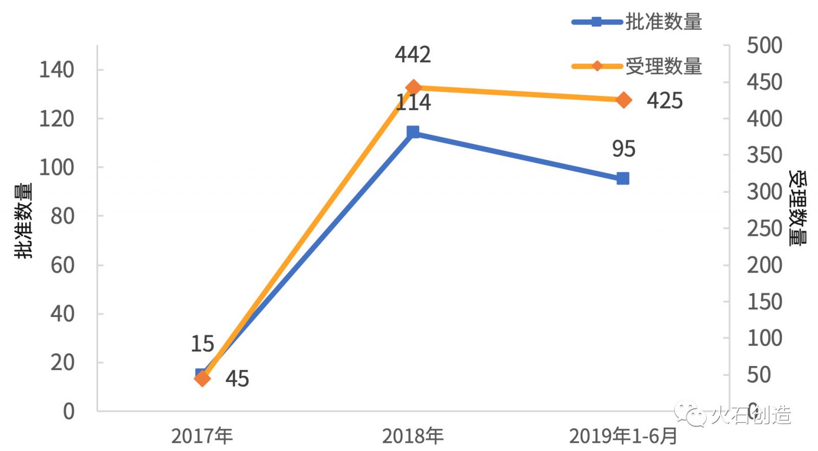 2017年、2018年和2019年H1获批产品数量分别为15、114和95个,而受理药品数量分别为45、442和425个。