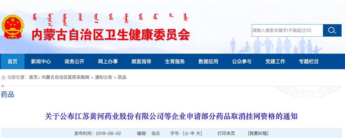 8月2日,内蒙古药品器械集中采购服务中心发布《关于公布江苏黄河药业股份有限公司等企业申请部分药品取消挂网资格的通知》(以下简称《通知》)。
