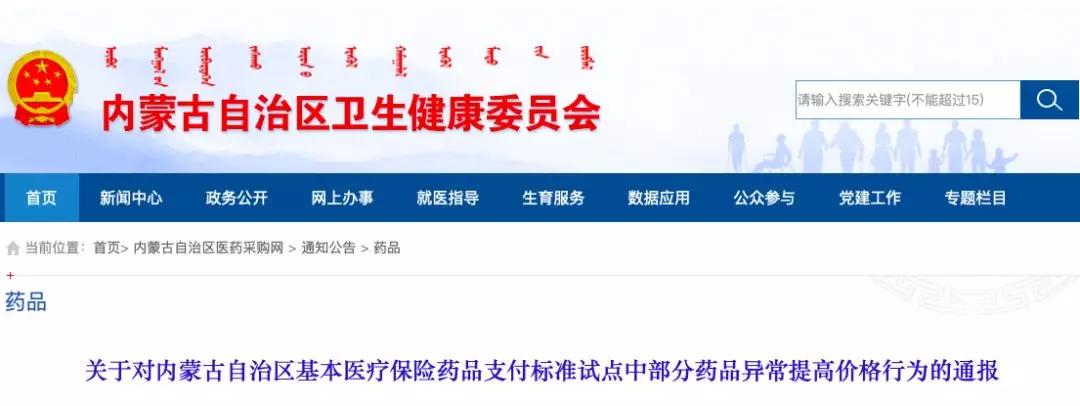 近日,内蒙古自治区卫健委发布《2019年关于对内蒙古自治区基本医疗保险药品支付标准试点中部分药品异常提高价格行为的通报》(以下简称《通报》)。