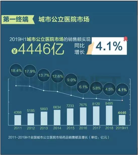 尤其是城市公立医院,2019年上半年的销售额增长率仅为4.1%,明显低于三大终端整体增长水平(5.8%)以及第一终端增长水平(4.8%)。