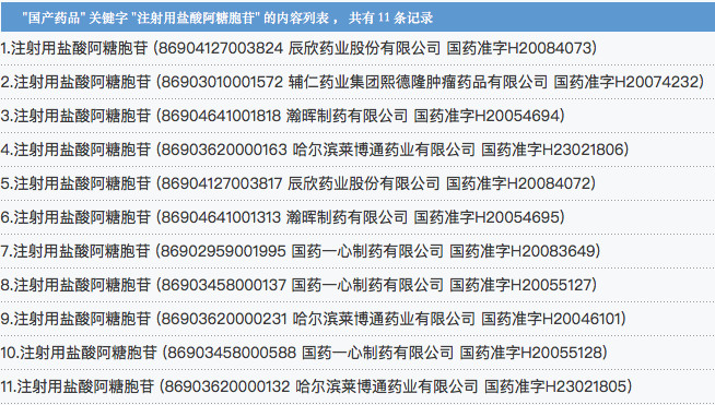 据国家药监局网站数据库,注射用盐酸阿糖胞苷的批准文号有11个,由国药一心制药、瀚晖制药、辰欣药业、辅仁药业集团等5家药企持有。