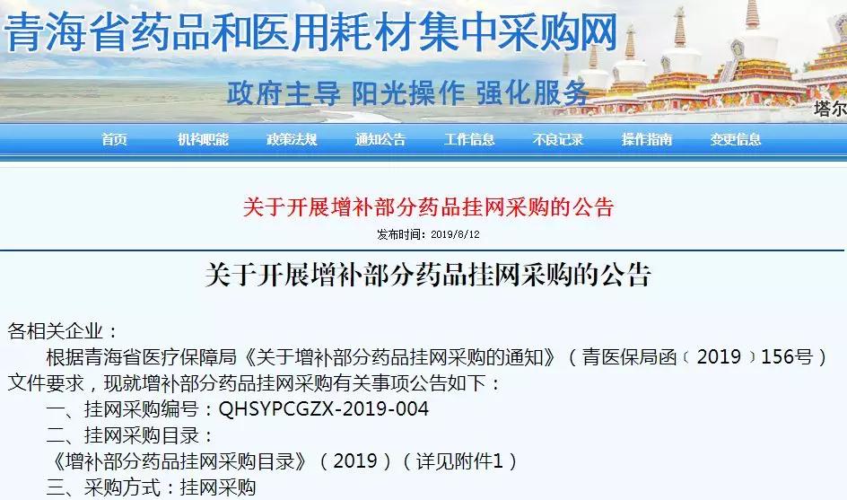虽说业界翘首以盼、网传本周将发布的新版国家医保目录仍是犹抱琵琶半遮面,但青海省还是给了不少创新产品一个“小惊喜”:根据该省医保局《关于增补部分药品挂网采购的通知》文件要求,正式挂网的《增补部分药品挂网采购目录(2019)》入围企业将在8月12日-9月6日期间报名。