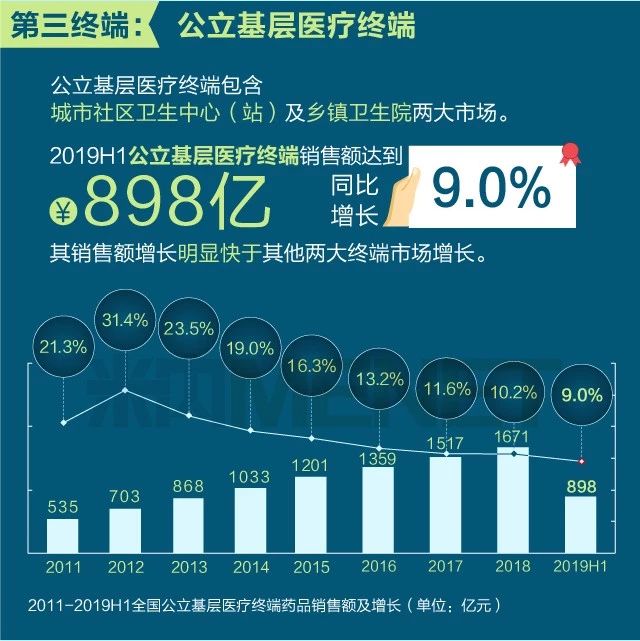 医药网9月2日讯 2019年上半年我国三大终端六大市场(定义范围详见文末“数据说明”)药品销售额实现9087亿元,同比增长5.8%。从实现药品销售的三大终端的销售额分布来看,公立医院终端市场份额最大,2019上半年占比为67%;零售药店终端市场份额2019上半年占比为23.1%;公立基层医疗终端市场份额近年有所上升,2019上半年占比为9.9%。以上统计数据未包含“民营医院、私人诊所、村卫生室”。