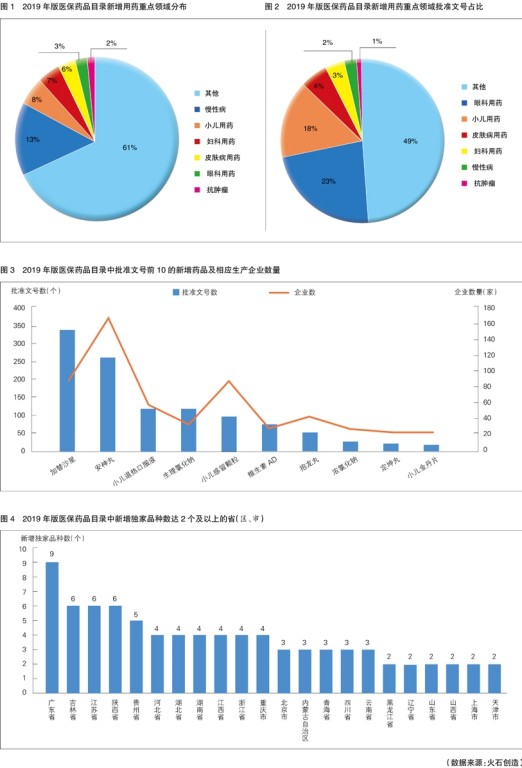 慢性病用药数量最多,眼科用药批准文号最多。2019年版医保药品目录新增药品主要集中在小儿用药、妇科用药、皮肤病用药、慢性病用药、眼科用药和抗肿瘤药六大重点领域。上述六大重点领域新增药品数量占新增药品总数的39%,其中慢性病用药数量最多,占新增药品总数的13%(见图1)。六大重点领域新增药品关联的批准文号数量达795个,占新增药品批准文号总数的51%,其中眼科用药的批准文号最多,占新增药品批准文号总数的23%,达355个(见图2)。