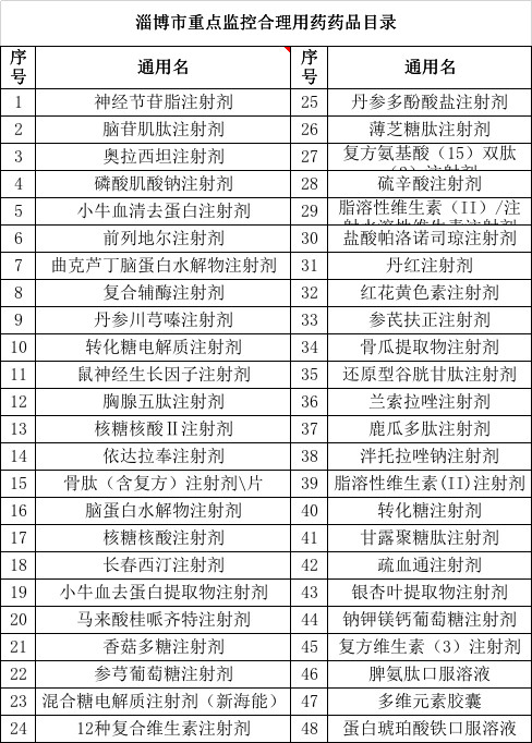 根据《淄博市重点监控合理用药药品目录》,共有48个药品在淄博市被纳入重点监控。