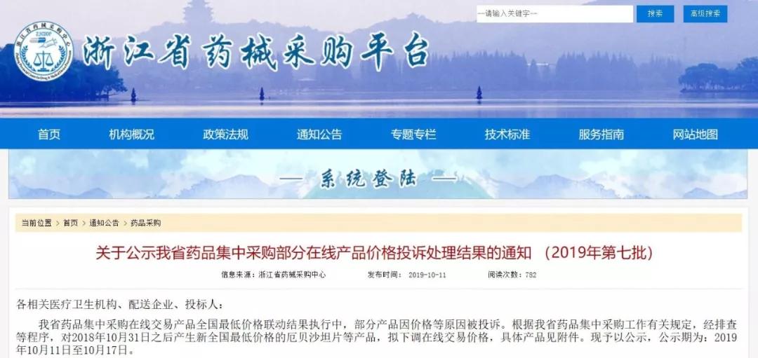 医药网10月12日讯 10月11日,浙江省药械采购平台发布《关于公示我省药品集中采购部分在线产品价格投诉处理结果的通知 (2019年第七批)》(简称《通知》),表示药品集中采购在线交易过程中,执行全国最低价格联动,对于《拟下调在线交易价格产品目录》企业产品因价格等原因遭到投诉,勒令相关产品在产生全国最低价后应下调价格,拒不调价的品种将给予“暂停在线交易”的处理措施。