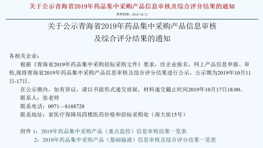 无独有偶,10月11日青海省药品和医用耗材集中采购网挂网《关于公示青海省2019年药品集中采购产品信息审核及综合评分结果的通知》,正式公布《2019年药品集中采购产品(重点监控)信息审核结果一览表》。按照此前公布的采购规则,针对采购数量大、采购金额高的重点监控药品,“不得高于现行全国最低省级采购价”。