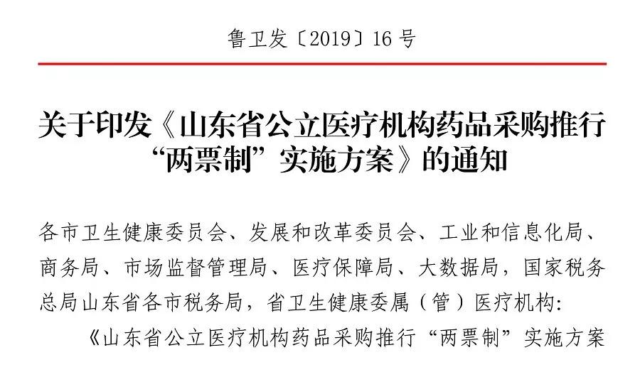 医药网10月15日讯 网传了许久,山东省的“两票制”方案终于露出“真容”:“在全省范围内各级公立医院的药品采购全面推行‘两票制’,同时鼓励非公医院也可积极推行‘两票制’,同时严控‘第三票’,试点实行‘一票制’。”这是山东省卫健委、发展委、医保局、大数据局、药监局等10部门近日联合发布的《山东省公立医疗机构药品采购推行“两票制”实施方案》(以下简称《方案》)提出的明确要求。