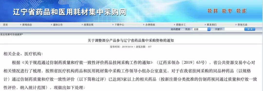 根据通知,同品种药品(以规格计)通过一致性评价的企业达到3家以上的,其他未通过一致性评价的药品、已在辽宁省药品集中采购平台挂网采购的,暂停挂网采购资格,从10月15日零时起将满足上述条件的药品暂停挂网采购。未在辽宁省药品集中采购平台挂网采购,暂不纳入辽宁省药品集中采购范围。