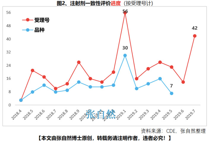 如下图所示,在去年年底4+7中选结果公布的那段时间,注射剂一致性评价申请达到了顶峰,2019年1月达56个,但4+7的降价幅度,使企业对一致性评价工作谨慎了很多,再后来,随着国家对带量采购的坚决执行,企业又提高了注射剂一致性评价的进度。