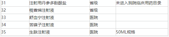 其中,国家重点监控的药品有,前列地尔、转化糖电解质、鼠神经生长因子、依达拉奉等;省级重点监控的药品有,康艾注射液、艾迪注射液、消癌平注射液(静脉注射);医院自行增补的三个药品分别是舒血宁注射液、苦碟子注射液、生脉注射液。