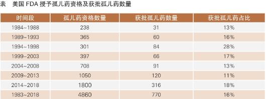 美国《孤儿药法案》实施前(1983年前),美国FDA批准的所有新药中,只有38种用来治疗罕见病。《孤儿药法案》通过后的1983~2018年,FDA批准上市的孤儿药达770个,授予孤儿药资格约4860个;2014~2018年,FDA授予孤儿药资格及孤儿药获批数量较1998年前显著增长(见表)。