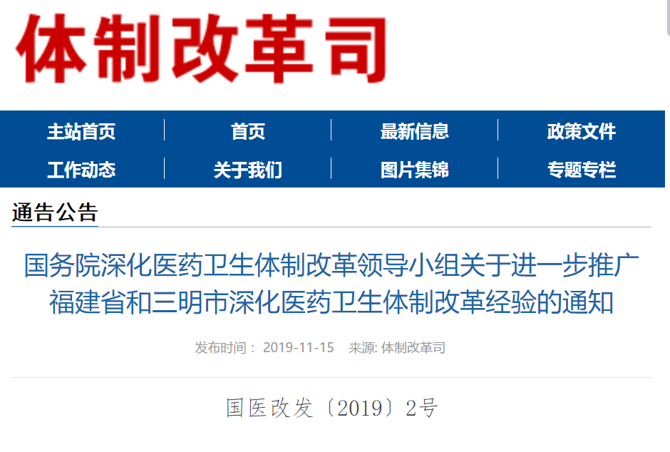 医药网11月16日讯 11月15日,国家卫健委体制改革司发布《国务院深化医药卫生体制改革领导小组关于进一步推广福建省和三明市深化医药卫生体制改革经验的通知》。文件提到2020年,按照国家统一部署,扩大国家组织集中采购和使用药品品种范围。