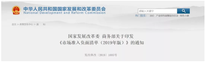 11月22日,国家发改委官网发布《国家发展改革委 商务部关于印发<市场准入负面清单(2019年版)>的通知》,提出认真落实党中央、国务院决策部署,会同各地区各有关部门对《市场准入负面清单》开展全面修订,经党中央、国务院批准印发。