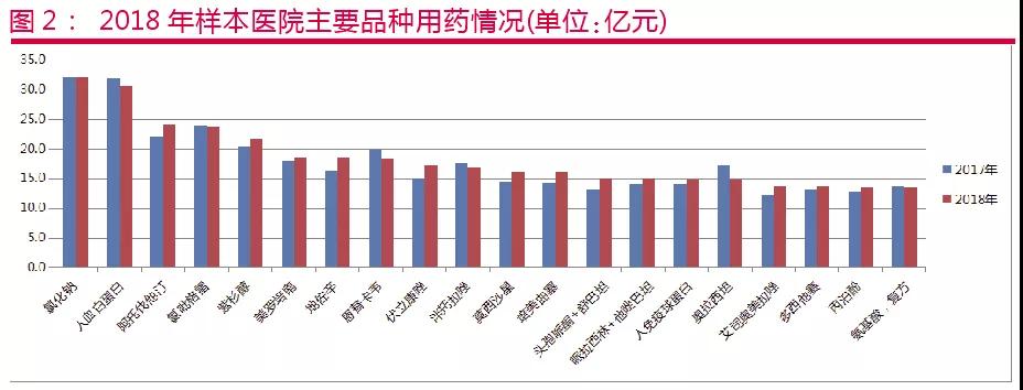 从样本医院通用名品种来看,2018年前10位品种购入金额占总金额的9.7%;前20位品种占16.1%;前30位品种占21.6%;前50位品种占30.4%;前100位品种占45.7%;前200位品种占64.3%。