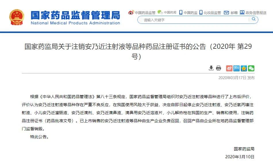 3月17日,国家药品监督管理局发布《关于注销安乃近注射液等品种药品注册证书的公告》(2020年第29号)和《关于修订安乃近相关品种说明书的公告》(2020年第34号),停止安乃近注射液等品种在我国的生产、销售和使用,注销药品注册证书,对安乃近片、重感灵片、重感灵胶囊、复方青蒿安乃近片等品种修订说明书。