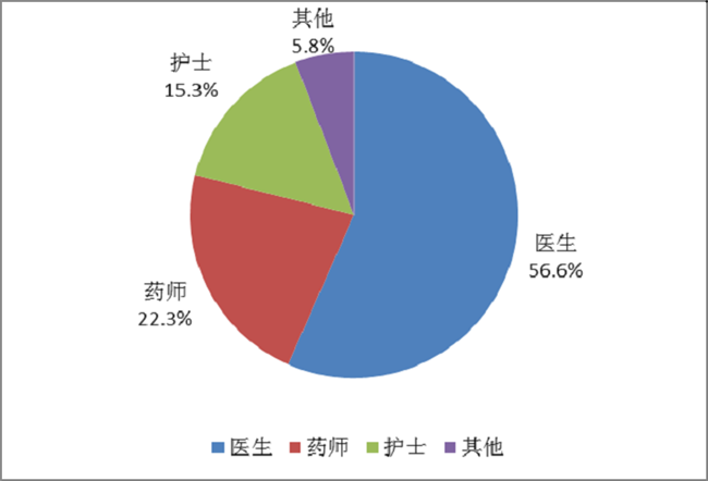 按照报告人职业统计,医生占56.6%,药师占22.3%,护士占15.3%,其他职业占5.8% (图4)。