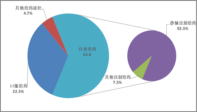 按照药品给药途径统计,注射给药占67.0%、口服给药占30.1%、其他给药途径占2.9%(图16)。注射给药中,静脉注射给药占92.7%、其他注射给药占7.3%。