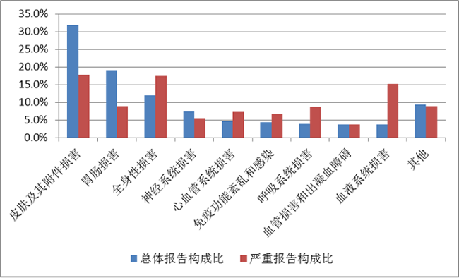 2019年国家基本药物化学药品和生物制品不良反应/事件报告,按照药品类别统计,报告数量排名前5位的分别是抗微生物药、心血管系统用药、抗肿瘤药、激素及影响内分泌药、治疗精神障碍药;累及器官系统排名前5位的是皮肤及其附件损害、胃肠损害、全身性损害、神经系统损害以及血液系统损害。