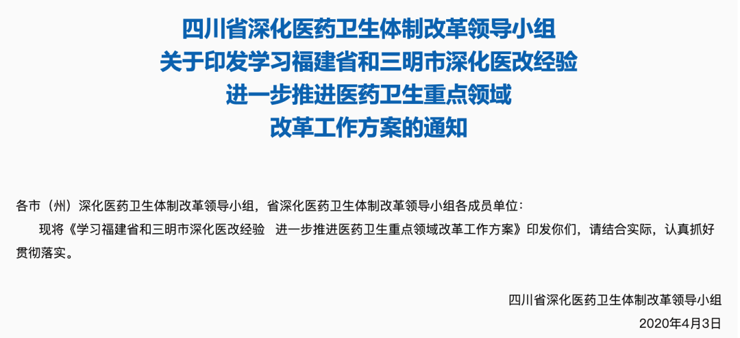 2019年12月23日,河北省深化医药卫生体制改革领导小组发布《进一步推广福建省和三明市深化医药卫生体制改革经验的实施方案》。重点关注方向: